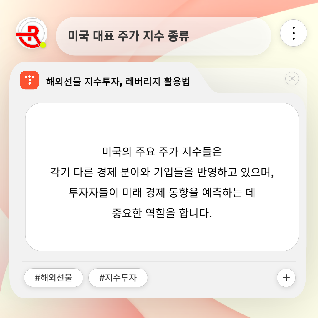 다우 존스 지수: 미국의 30개 대형 기업으로 구성된 지수로, 금융, 산업, 소비재 등 다양한 분야의 기업들이 포함됩니다. 대표 기업으로 3M, Apple, Boeing 등이 있습니다.