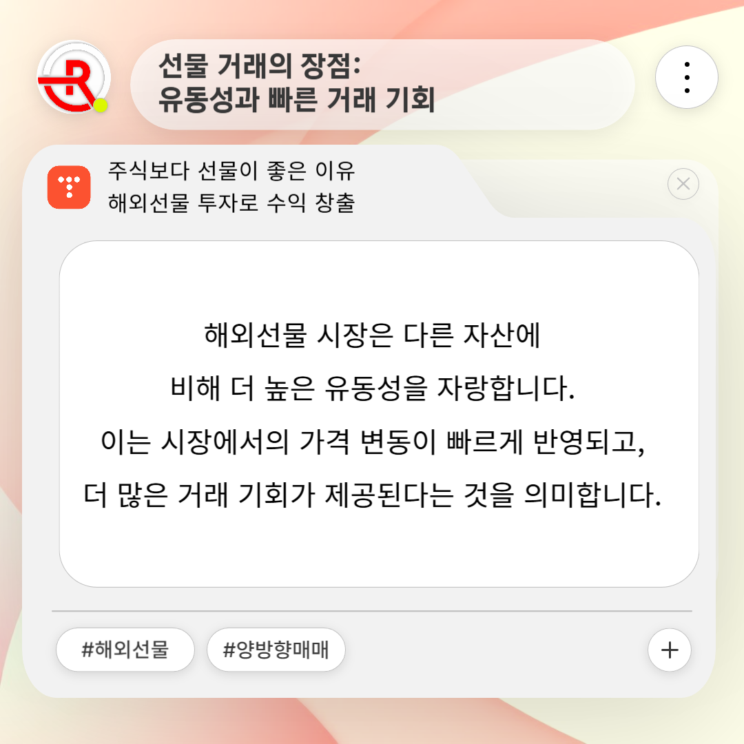 해외선물 시장은 다른 자산에 비해 더 높은 유동성을 자랑합니다. 이는 시장에서의 가격 변동이 빠르게 반영되고, 더 많은 거래 기회가 제공된다는 것을 의미합니다. 주식 시장은 가격 변동성이 크지 않거나 거래가 느려서 기회를 놓칠 수 있지만, 선물 시장은 더 활발하게 움직입니다.