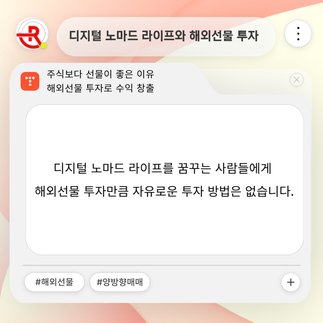 디지털 노마드 라이프를 꿈꾸는 사람들에게 해외선물 투자만큼 자유로운 투자 방법은 없습니다. 해외선물은 주식 투자처럼 복잡한 기업 분석을 요구하지 않으며, 기술적 분석만으로 충분히 수익을 낼 수 있습니다. 이는 시간과 장소에 구애받지 않고 언제 어디서나 트레이딩을 할 수 있는 장점이 있습니다.