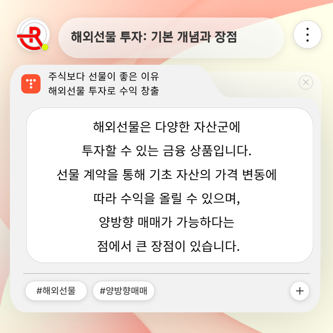 해외선물은 다양한 자산군에 투자할 수 있는 금융 상품입니다. 선물 계약을 통해 기초 자산의 가격 변동에 따라 수익을 올릴 수 있으며, 양방향 매매가 가능하다는 점에서 큰 장점이 있습니다. 주식에서는 상승장에만 투자할 수 있지만, 해외선물은 상승과 하락을 모두 예측하고 투자할 수 있어 경제 전반의 변화에 유연하게 대응할 수 있습니다.