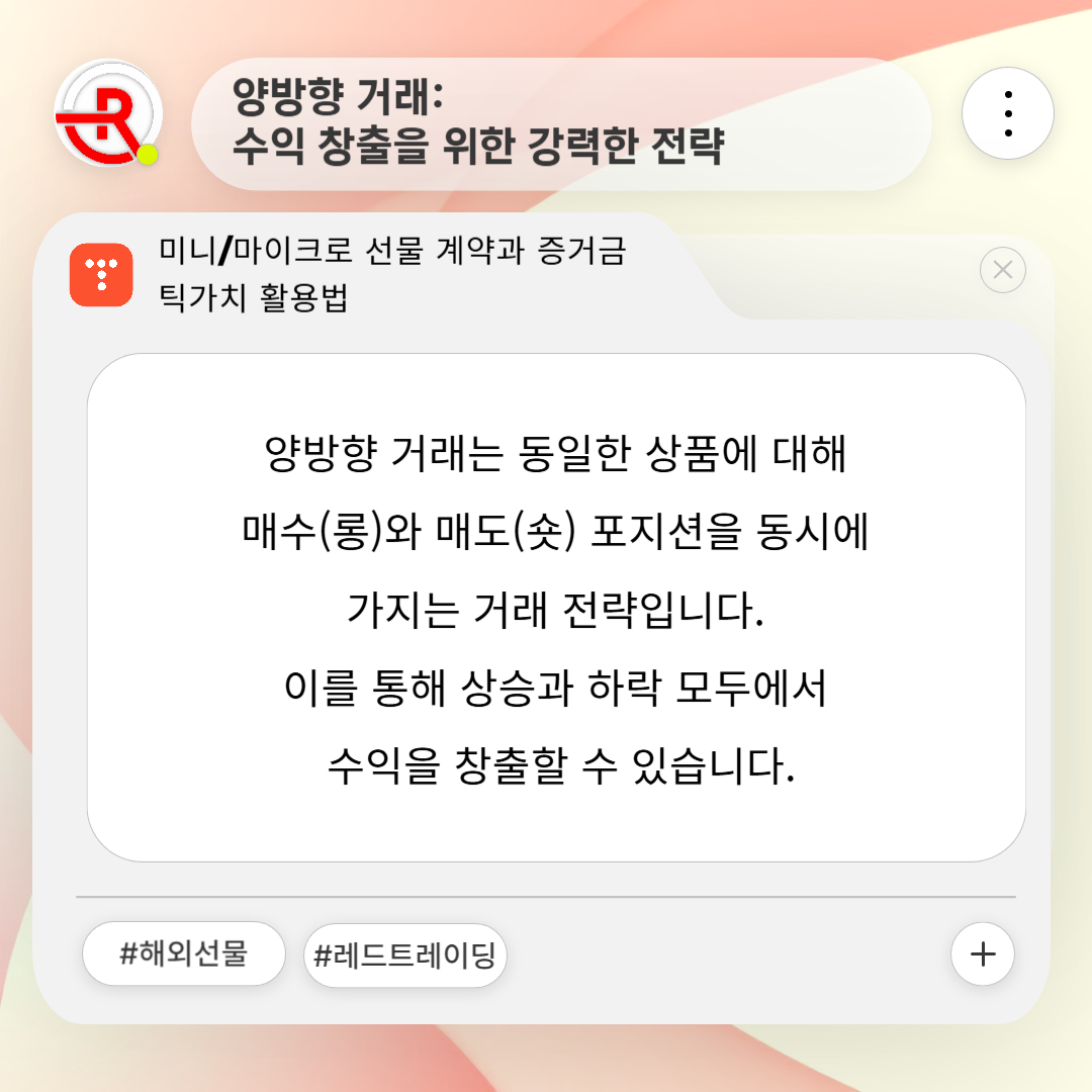 양방향 거래는 동일한 상품에 대해 매수(롱)와 매도(숏) 포지션을 동시에 가지는 거래 전략입니다. 이를 통해 상승과 하락 모두에서 수익을 창출할 수 있습니다.