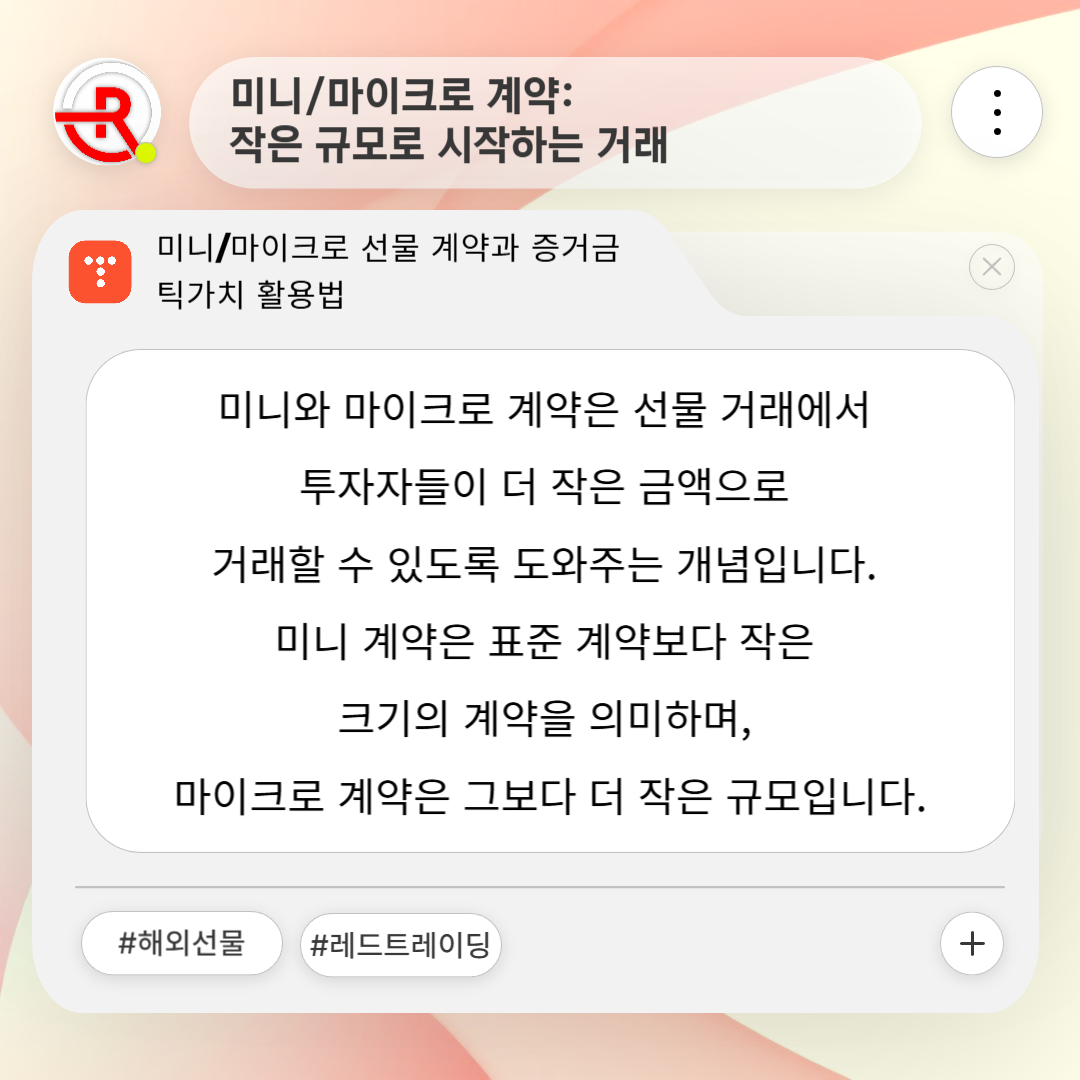 미니와 마이크로 계약은 선물 거래에서 투자자들이 더 작은 금액으로 거래할 수 있도록 도와주는 개념입니다. 미니 계약