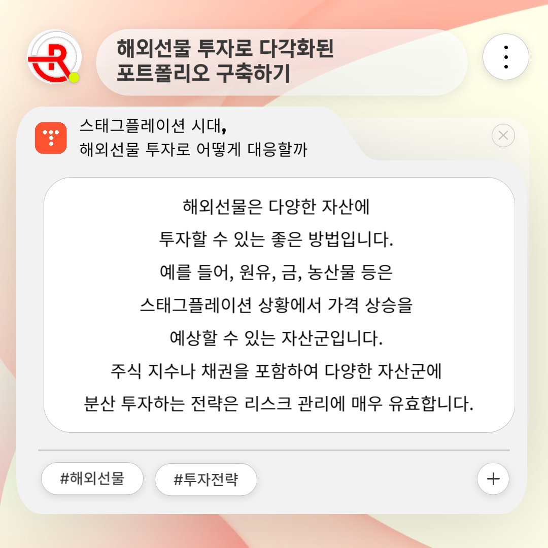 해외선물은 다양한 자산에 투자할 수 있는 좋은 방법입니다. 예를 들어, 원유, 금, 농산물 등은 스태그플레이션 상황에서 가격 상승을 예상할 수 있는 자산군입니다. 주식 지수나 채권을 포함하여 다양한 자산군에 분산 투자하는 전략은 리스크 관리에 매우 유효합니다.