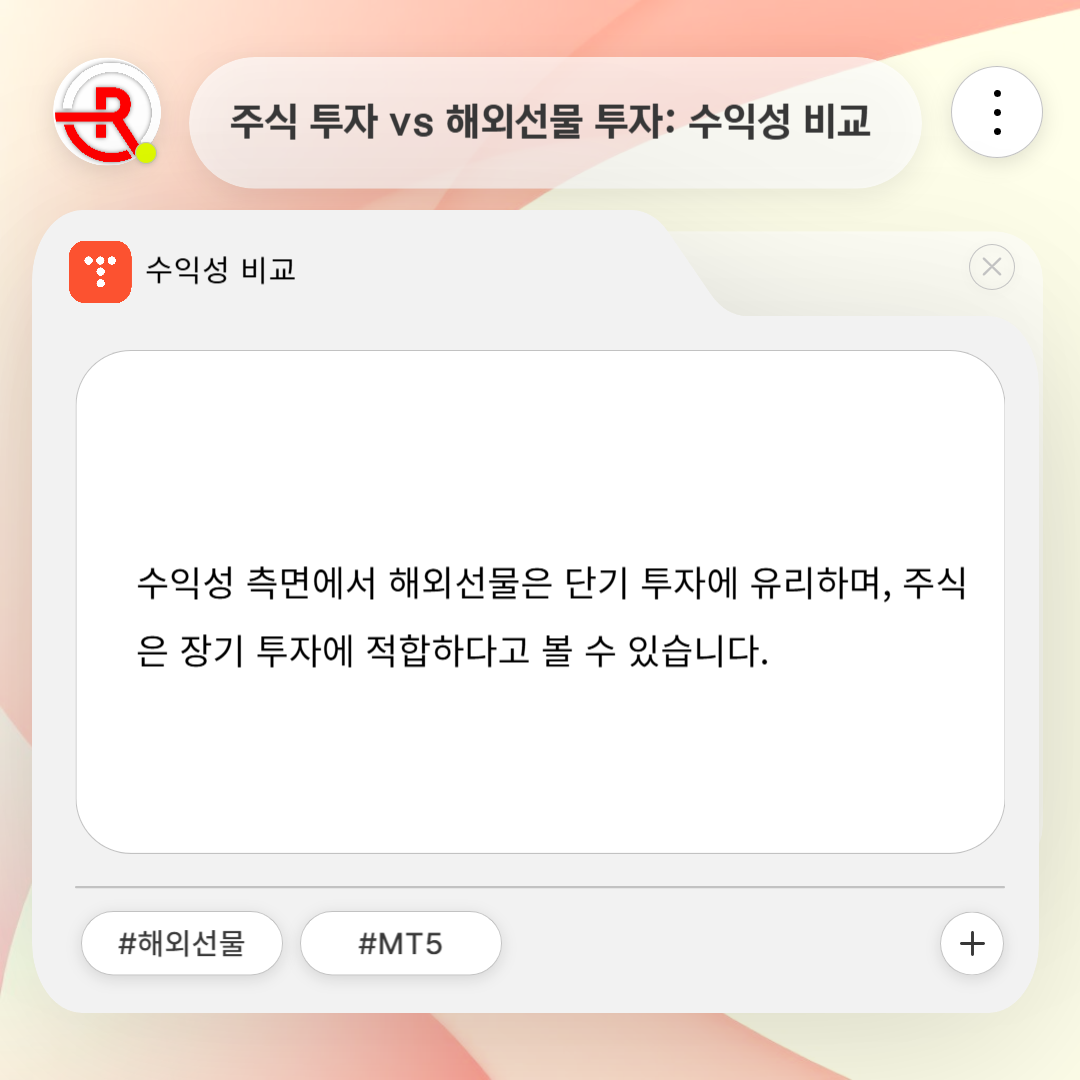 따라서 수익성 측면에서 해외선물은 단기 투자에 유리하며, 주식은 장기 투자에 적합하다고 볼 수 있습니다.