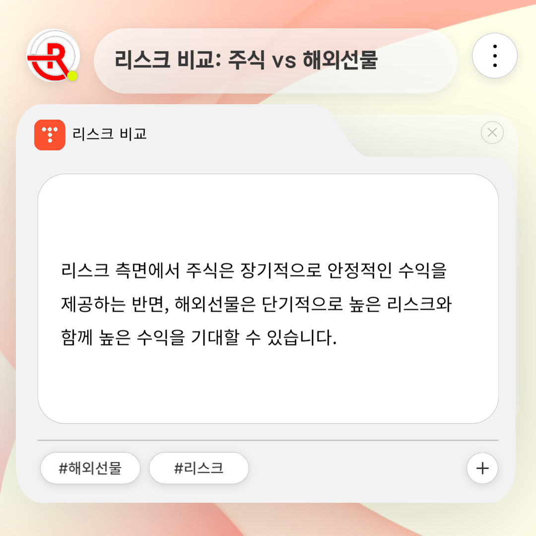 따라서 리스크 측면에서 주식은 장기적으로 안정적인 수익을 제공하는 반면, 해외선물은 단기적으로 높은 리스크와 함께 높은 수익을 기대할 수 있습니다.