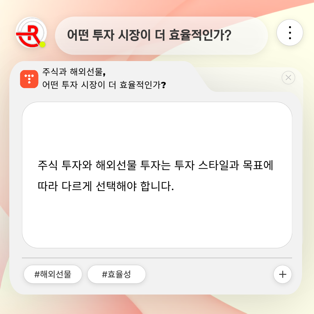 주식과 해외선물은 각기 다른 특성을 가진 투자 시장으로, 수익성과 리스크에서 큰 차이를 보입니다. 주식은 장기적으로 안정적 수익을 얻을 수 있는 시장이라면, 해외선물은 단기적으로 더 높은 수익을 목표로 할 수 있는 시장입니다. 여러분은 어떤 투자 시장이 더 적합하다고 생각하시나요? 주식 투자와 해외선물 투자에서의 경험을 댓글로 공유해 주세요!