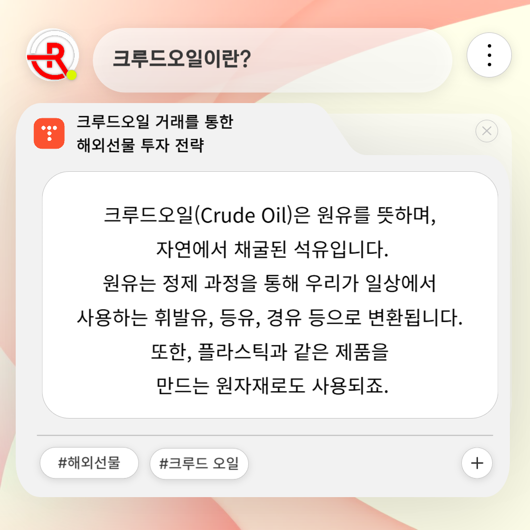 크루드오일(Crude Oil)은 원유를 뜻하며, 자연에서 채굴된 석유입니다. 원유는 정제 과정을 통해 우리가 일상에서 사용하는 휘발유, 등유, 경유 등으로 변환됩니다. 또한, 플라스틱과 같은 제품을 만드는 원자재로도 사용되죠.