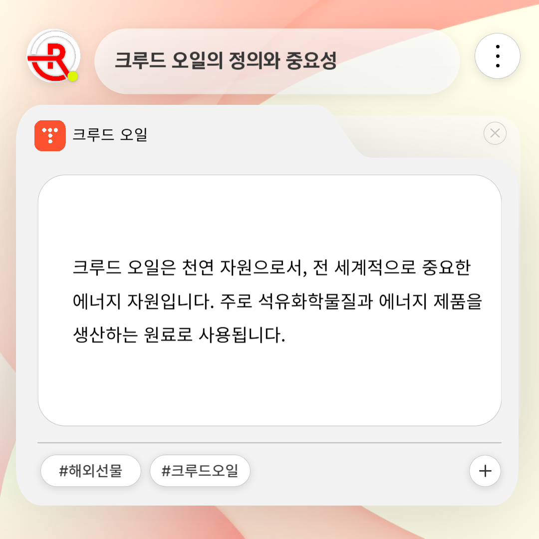 크루드 오일은 천연 자원으로서, 전 세계적으로 중요한 에너지 자원입니다. 주로 석유화학물질과 에너지 제품을 생산하는 원료로 사용되며, 국제적 원유의 가격 변동성은 글로벌 경제에 큰 영향을 미칩니다. 특히, 중동 지역에서 발생한 분쟁은 원유의 가격을 더욱 불안정하게 만들고 있으며, 이는 전 세계 시장에 연쇄적인 영향을 끼칩니다.