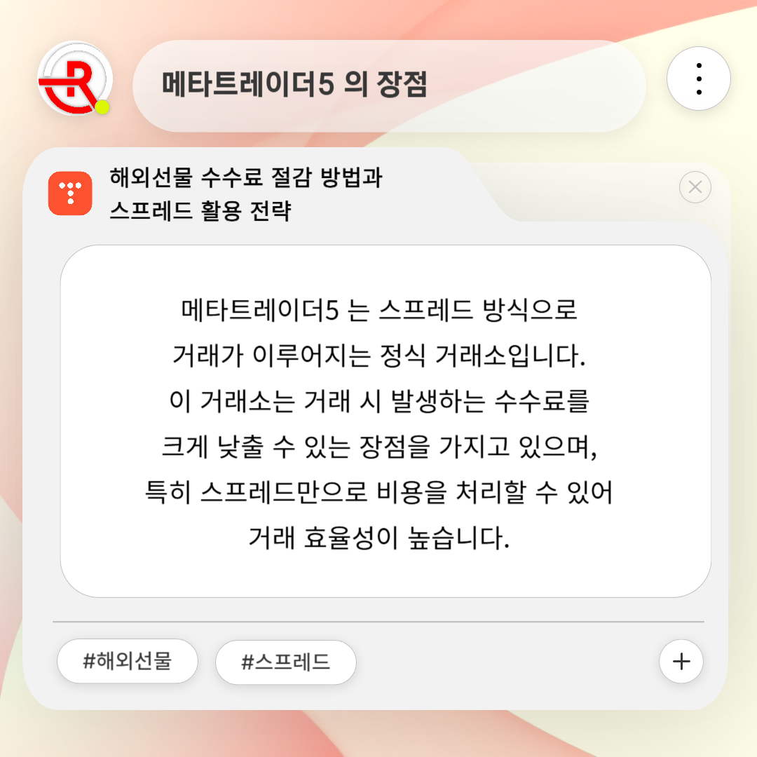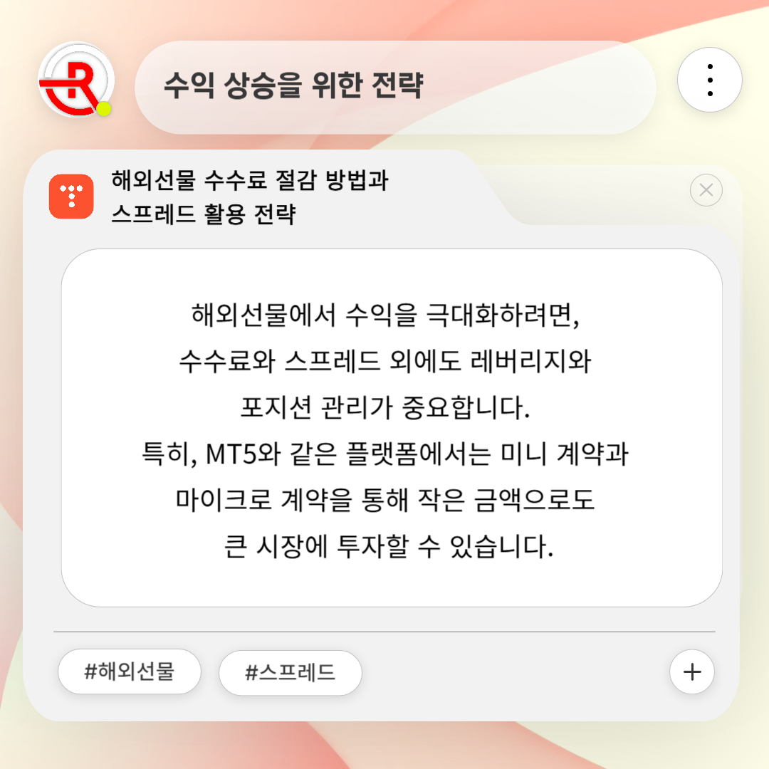 해외선물 거래에서 수수료와 스프레드는 수익에 중요한 영향을 미칩니다. 이를 절감하기 위해서는, 거래소 선택 시 비용 구조를 꼼꼼히 확인하고, 메타트레이더5 와 같은 신뢰할 수 있는 거래소에서 효율적으로 거래를 진행하는 것이 중요합니다. 또한, 스프레드와 수수료 절감 외에도 레버리지 활용과 포지션 관리가 수익을 상승시키는 중요한 요소임을 기억해야 합니다.
