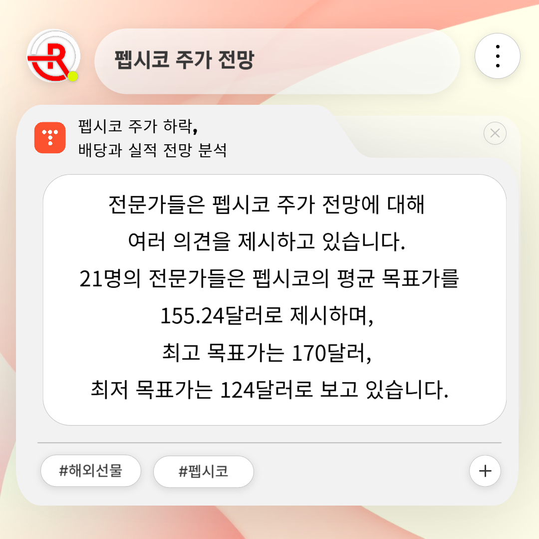 전문가들은 펩시코 주가 전망에 대해 여러 의견을 제시하고 있습니다. 21명의 전문가들은 펩시코의 평균 목표가를 155.24달러로 제시하며, 최고 목표가는 170달러, 최저 목표가는 124달러로 보고 있습니다. 또 다른 투자 모델에서는 펩시코의 적정 가치를 176.54달러로 제시하고 있으며, 최고 목표가는 219달러로 매우 보수적인 평가를 내리고 있습니다.