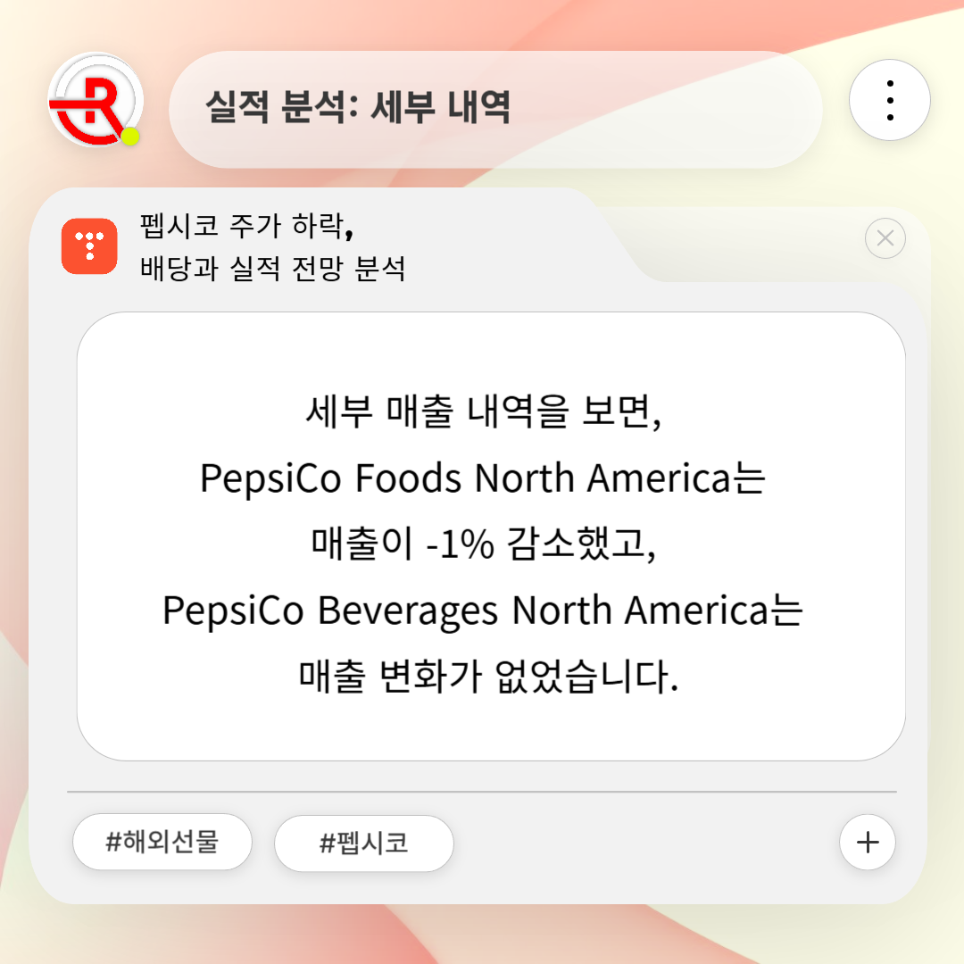 세부 매출 내역을 보면, PepsiCo Foods North America는 매출이 -1% 감소했고, PepsiCo Beverages North America는 매출 변화가 없었습니다. International Beverages Franchise는 +3% 증가했으며, 유럽, 중동, 아프리카(EAME) 지역은 -2% 감소했습니다. 특히 Latin America Foods 부문은 -12% 감소하여 큰 부진을 겪었습니다.