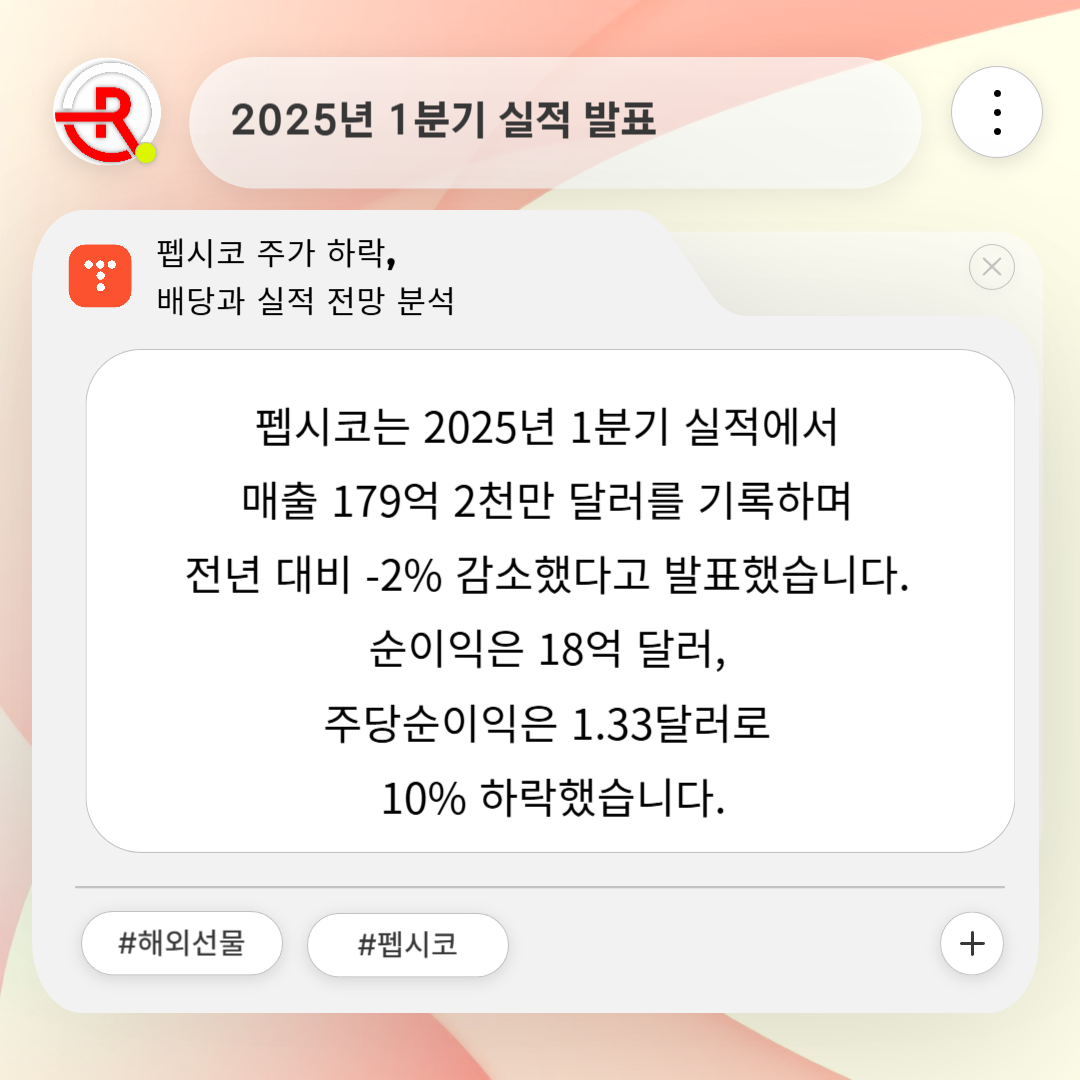펩시코는 2025년 1분기 실적에서 매출 179억 2천만 달러를 기록하며 전년 대비 -2% 감소했다고 발표했습니다. 순이익은 18억 달러, 주당순이익은 1.33달러로 10% 하락했습니다. 실적은 일부 예상보다 매출이 높았지만, 주당순이익은 시장 예상을 하회하며 주가에 부정적인 영향을 미쳤습니다.