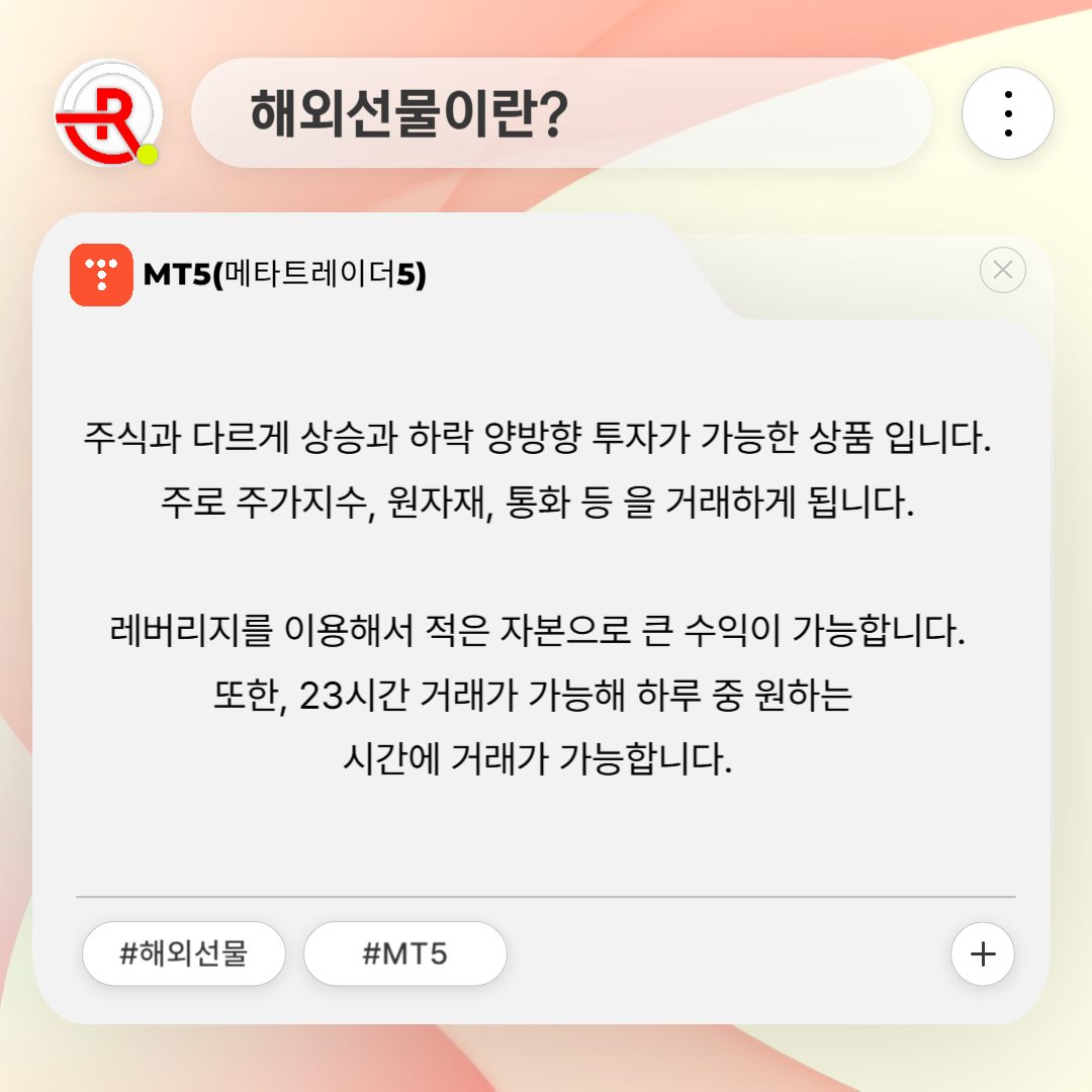 해외선물은 주식, 원자재, 통화 등의 자산을 미리 정한 가격에 특정 시점에 사고파는 계약을 말합니다. 예를 들어,