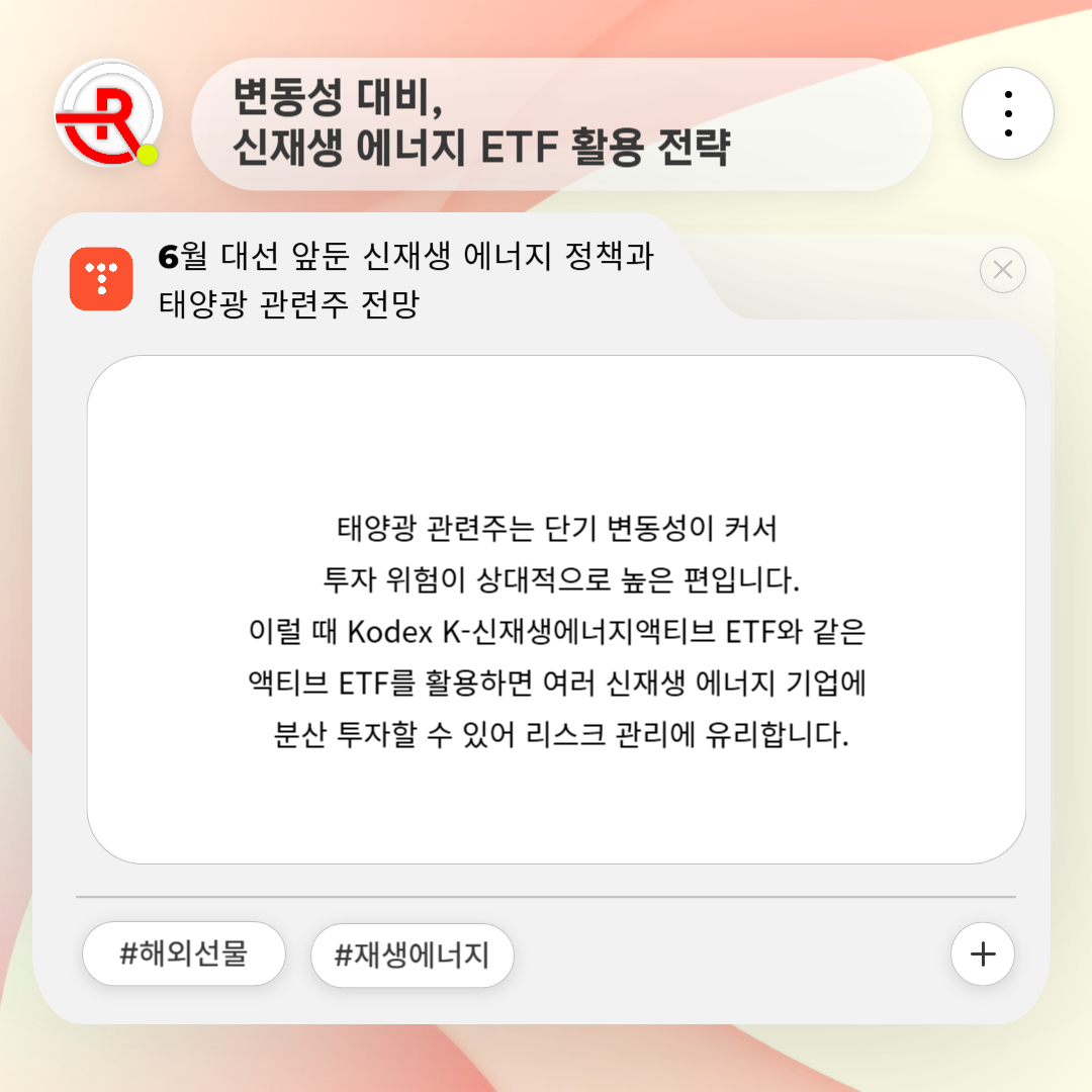 이럴 때 Kodex K-신재생에너지액티브 ETF와 같은 액티브 ETF를 활용하면 여러 신재생 에너지 기업에 분산 투자할 수 있어 리스크 관리에 유리합니다.