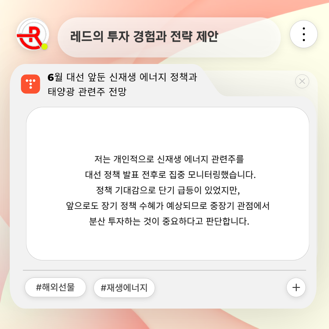정책 기대감으로 단기 급등이 있었지만, 앞으로도 장기 정책 수혜가 예상되므로 중장기 관점에서 분산 투자하는 것이 중요하다고 판단합니다.