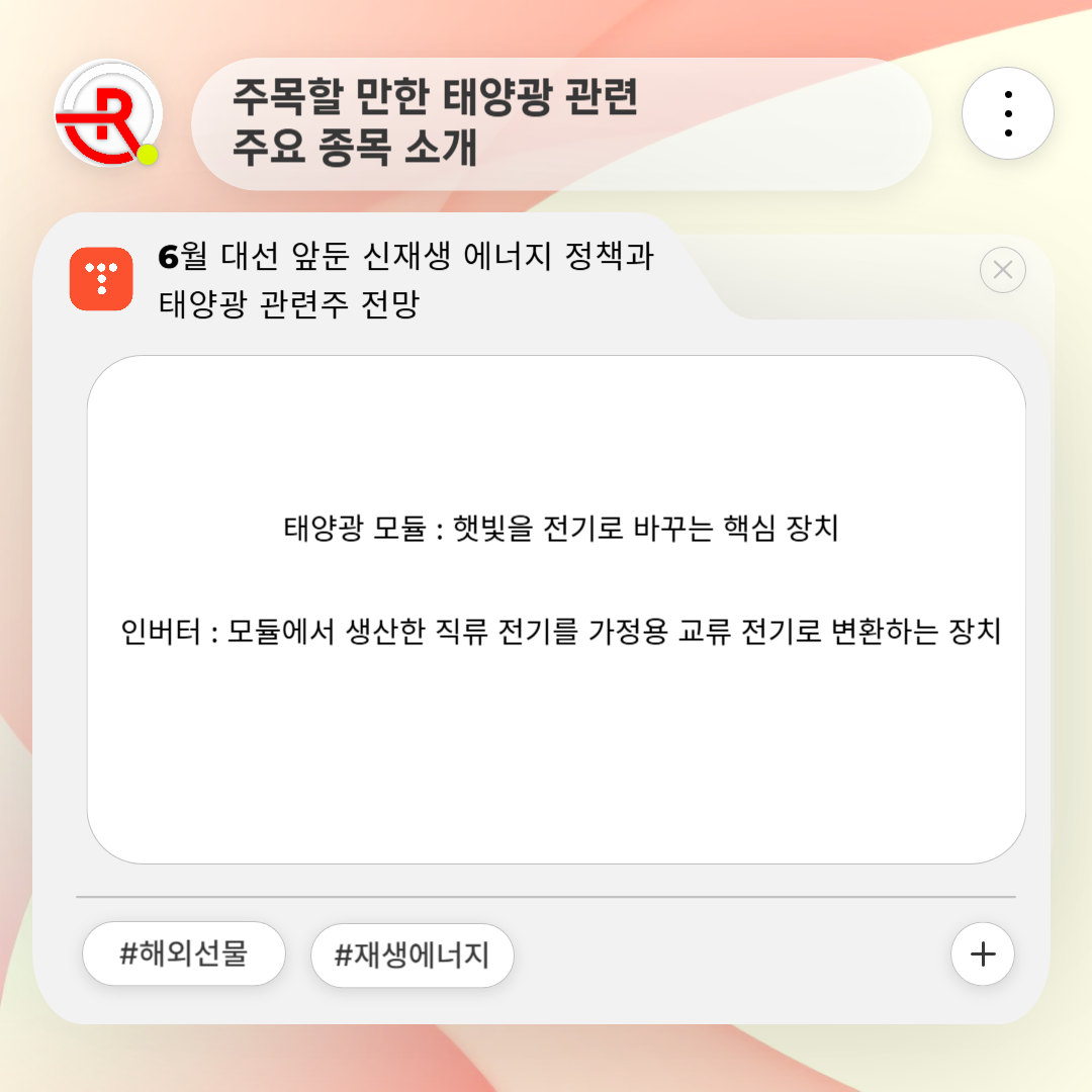 오늘은 6월 대선을 앞두고 뜨거운 관심을 받고 있는 신재생 에너지 관련주에 대해 이야기해보려 합니다.