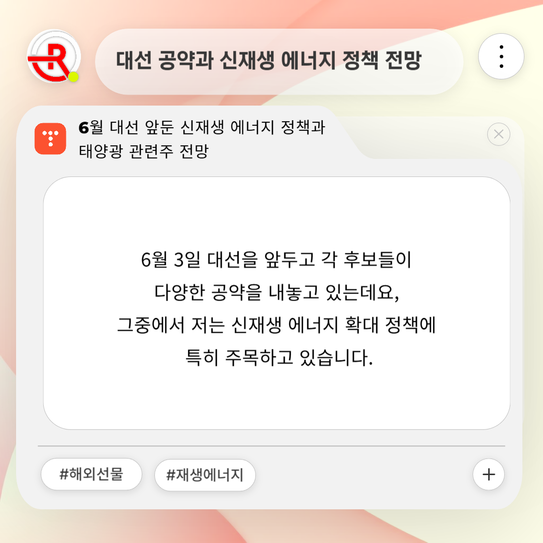 6월 13일 대선을 앞두고 각 후보들이 다양한 공약을 내놓고 있는데요, 그중에서 저는 신재생 에너지 확대 정책에 특히 주목하고 있습니다.