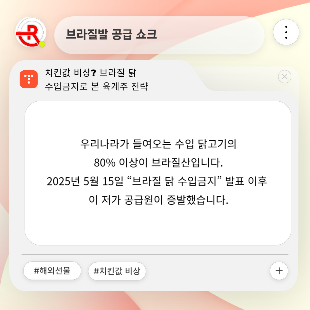 우리나라가 들여오는 수입 닭고기의 80% 이상이 브라질산입니다. 2025년 5월 15일 “브라질 닭 수입금지” 발표 이후 이 저가 공급원이 증발했습니다. 프랜차이즈 본사들은 긴급 대체 수급선을 찾느라 분주했고, 소비자는 SNS에 ‘치킨 3만 원 시대’라는 우스갯소리를 올렸죠. 국내 육계주 거래량도 급증했습니다.