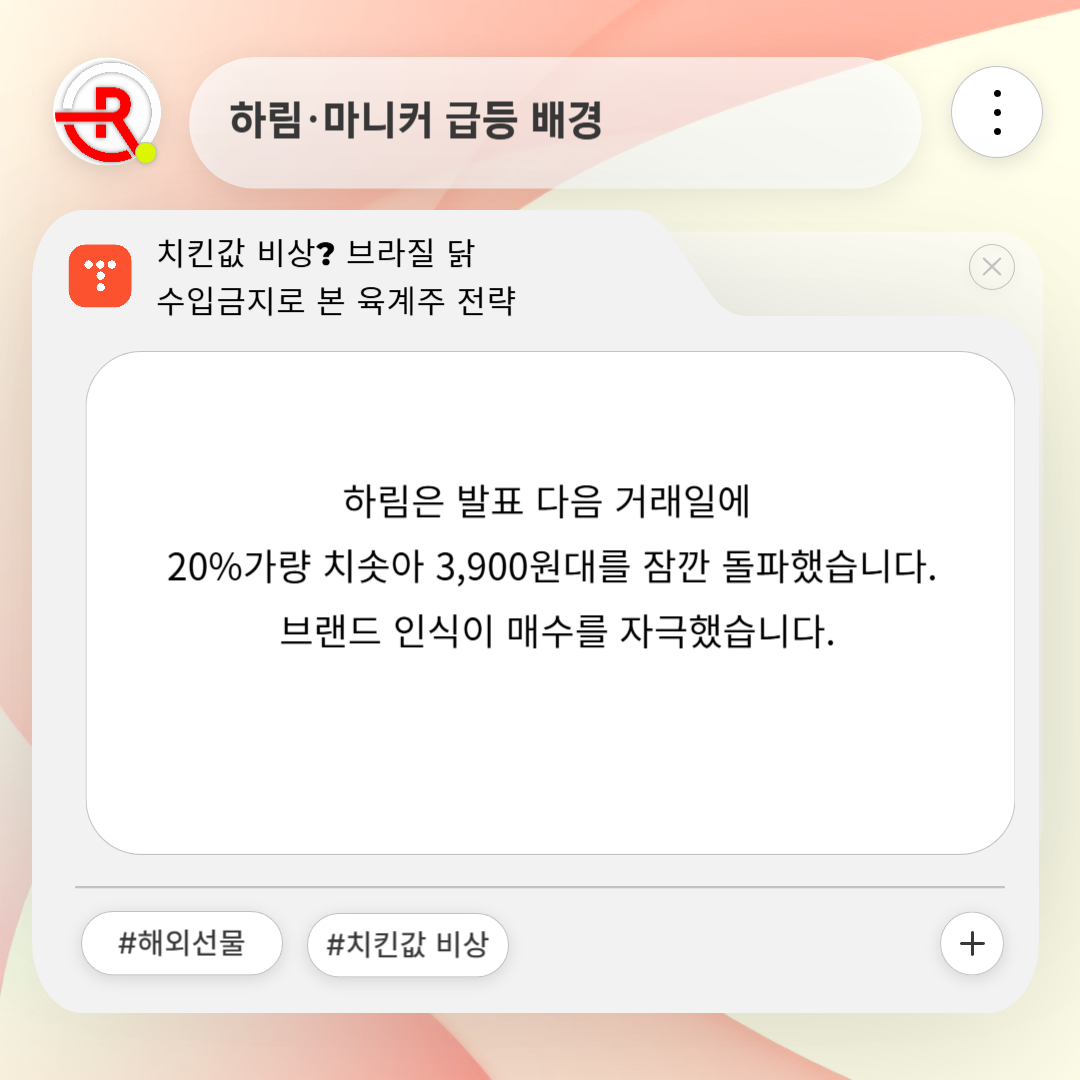 하림은 발표 다음 거래일에 20%가량 치솟아 3,900원대를 잠깐 돌파했습니다. 브랜드 인식이 매수를 자극했습니다. 마니커도 상한가 부근까지 급등했지만 하루 만에 11% 조정을 받으며 테마주의 속성을 드러냈죠. 저는 당시 장중 분봉을 보며 호가 공백이 커지는 구간마다 일부 물량을 덜어내 손실을 방어했습니다.