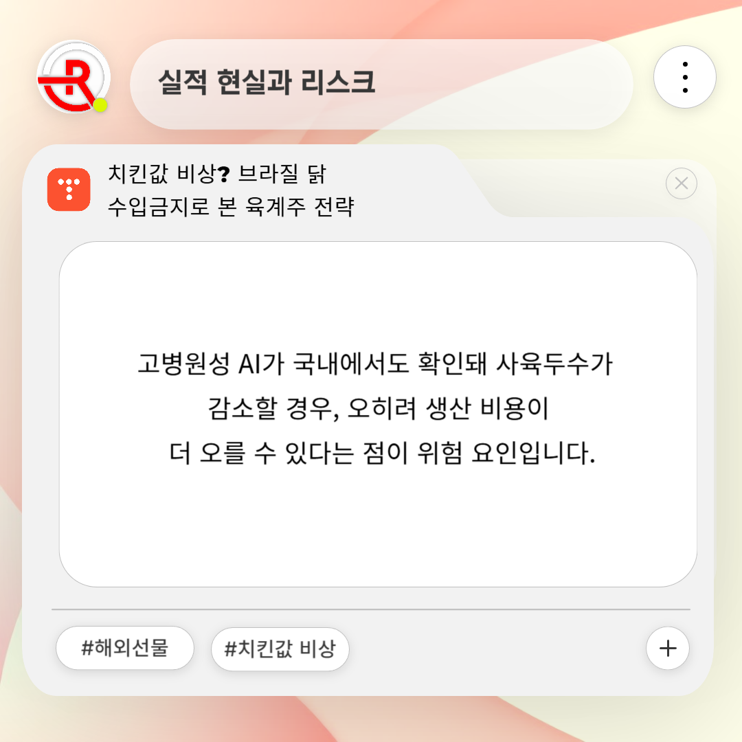 최근 하림의 영업이익률은 2%대, ROE는 ?4% 수준입니다. 마니커는 적자 상태라 재무 체력이 약하죠. 원가가 지속 상승하면 기대만으로는 주가를 지탱하기 어렵습니다. 특히 고병원성 AI가 국내에서도 확인돼 사육두수가 감소할 경우, 오히려 생산 비용이 더 오를 수 있다는 점이 위험 요인입니다.