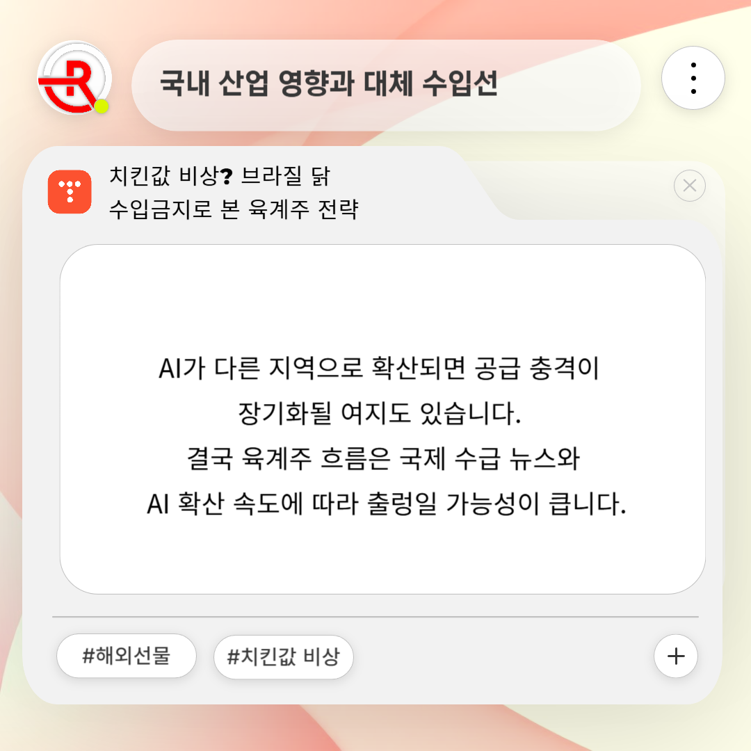 국내 프랜차이즈 협회 관계자에게 전화해 보니, 계약 단가가 최소 두 달치씩 묶여 있어 즉각적 가격 인상은 피할 수 없지만, 여름 성수기 이전에 재협상이 불가피하다고 하더군요. 환율이 1,400원을 넘어설 경우 수입선 전환 비용도 커지기 때문에 주가 변동성은 더 커질 수 있습니다. 과거 2022년 AI 파동 때도 비슷한 패턴이 있었는데, 당시 저는 초기 급등 뒤 2주간 급락하는 과정에서 눌림목을 활용해 평균단가를 15% 낮췄습니다. 이번 사태에서도 같은 시나리오가 반복될지 지켜보고 있습니다. 정부는 태국·미국 등으로 수입선을 분산하며 가격 상승 압력을 완화하려 노력 중입니다. 반대로 AI가 다른 지역으로 확산되면 공급 충격이 장기화될 여지도 있습니다. 결국 육계주 흐름은 국제 수급 뉴스와 AI 확산 속도에 따라 출렁일 가능성이 큽니다.