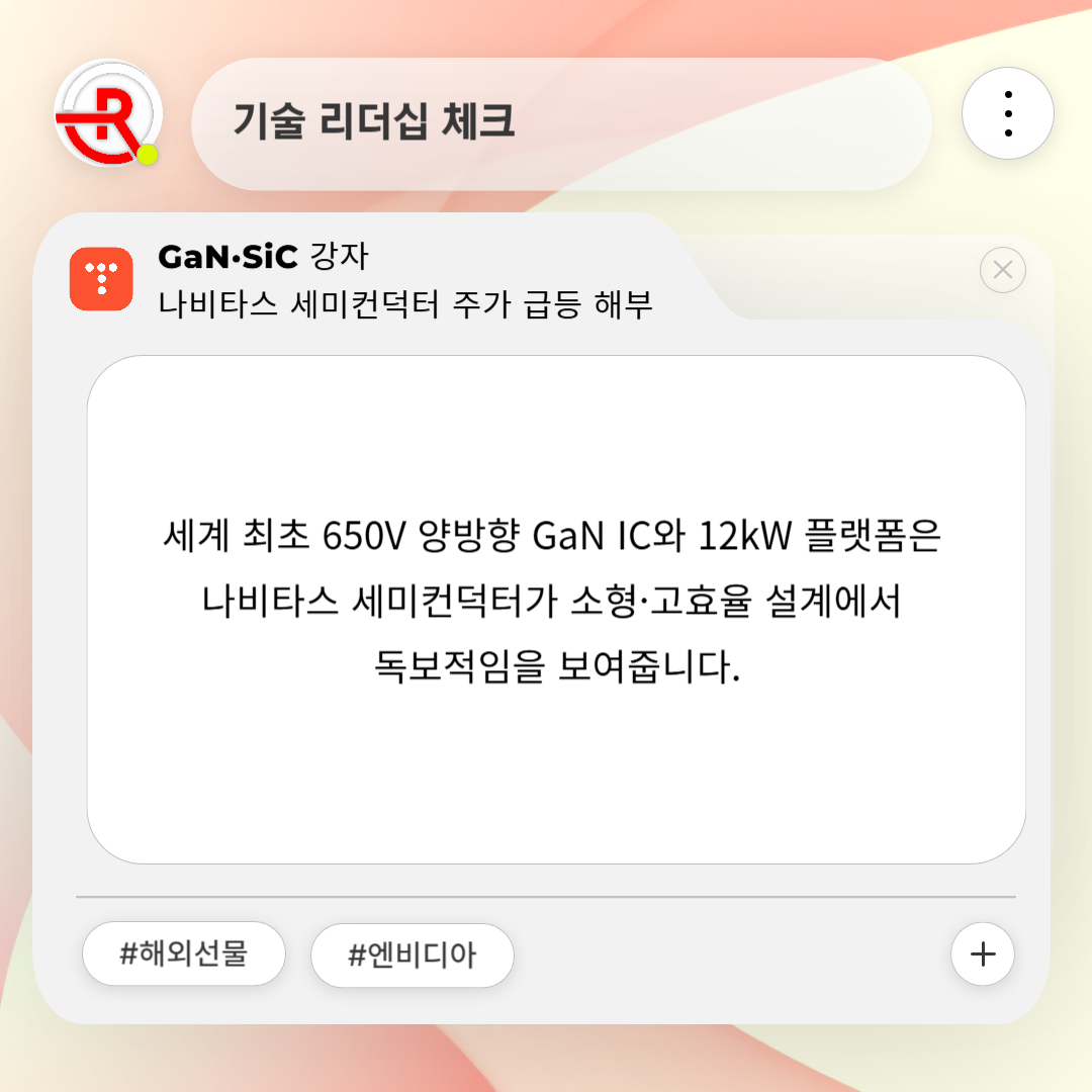 세계 최초 650V 양방향 GaN IC와 12kW 플랫폼은 나비타스 세미컨덕터가 소형·고효율 설계에서 독보적임을 보여줍니다. AI, 전기차, 재생에너지 세 섹터에 동시에 침투한 점도 매력적입니다. 실물 출하량이 2억 5천만 개를 넘겼다는 팩트는 ‘개념주’와의 차별화를 설명해 줍니다. 최근 출시된 IsoFast 절연 드라이버는 단계 응답 시간이 극단적으로 짧아 전력 스파이크를 최소화해 AI 서버 운영비를 절감합니다.
