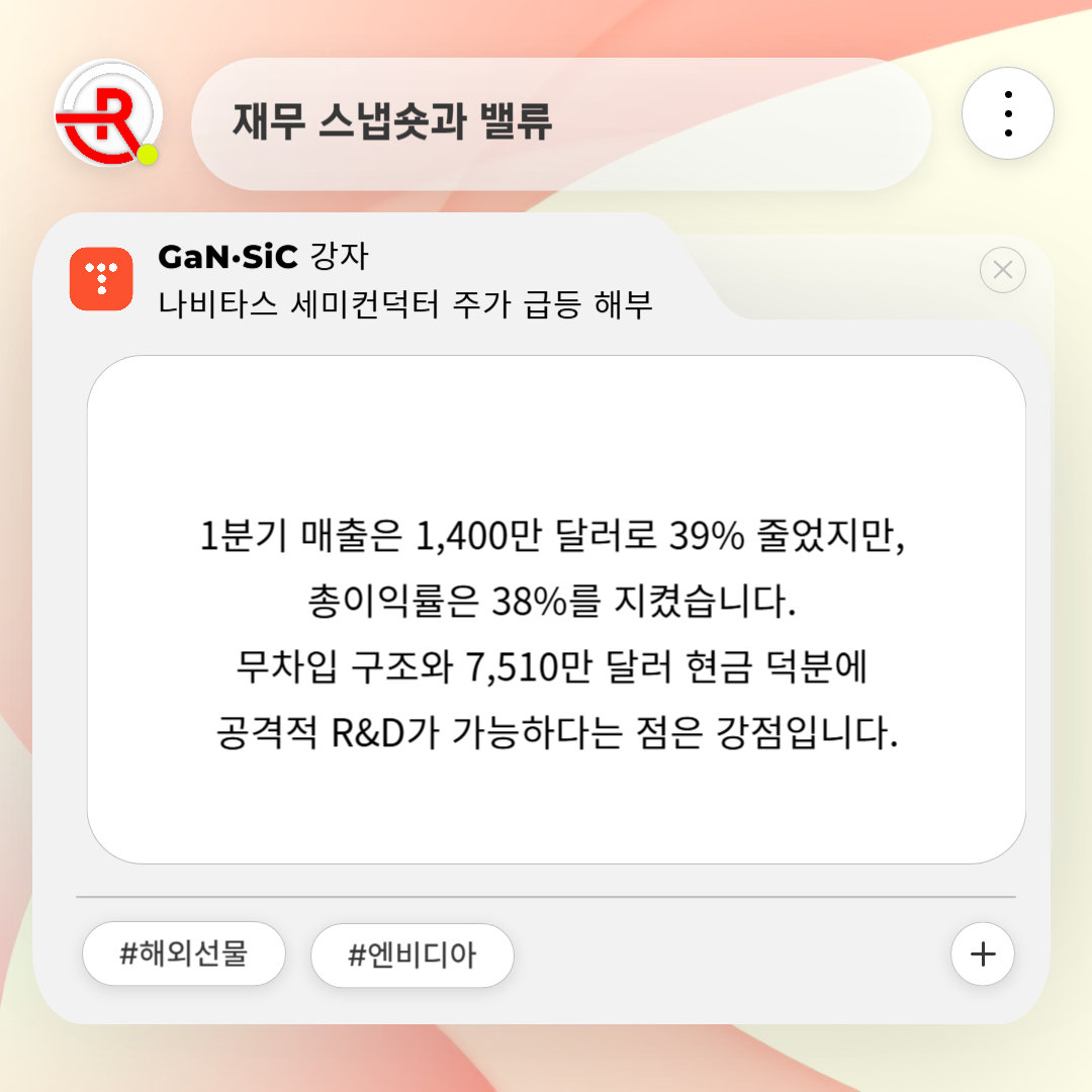 결국 성장 스토리는 ‘수익성 회복’과 ‘대형 고객 확대’ 두 축에 달려 있습니다. 나비타스 세미컨덕터가 다음 분기에도 디자인 윈을 추가한다면, 저는 단기 차익을 일부 확정해 현금 비중을 높이고 조정 구간에 재진입할 계획입니다. 핵심 기술이 산업 변화를 이끄는 시점에 올라타되, 재무 턴어라운드 확인 전 과도한 레버리지는 피한다 ? 이것이 제 원칙입니다. 또한 목표 가격대에 도달하면 콜옵션 매도로 일부 수익을 고정해 시장 충격을 흡수하는 방법을 병행합니다. 이는 대형 기술주 변동성 랠리에서 유용했던 전술입니다.