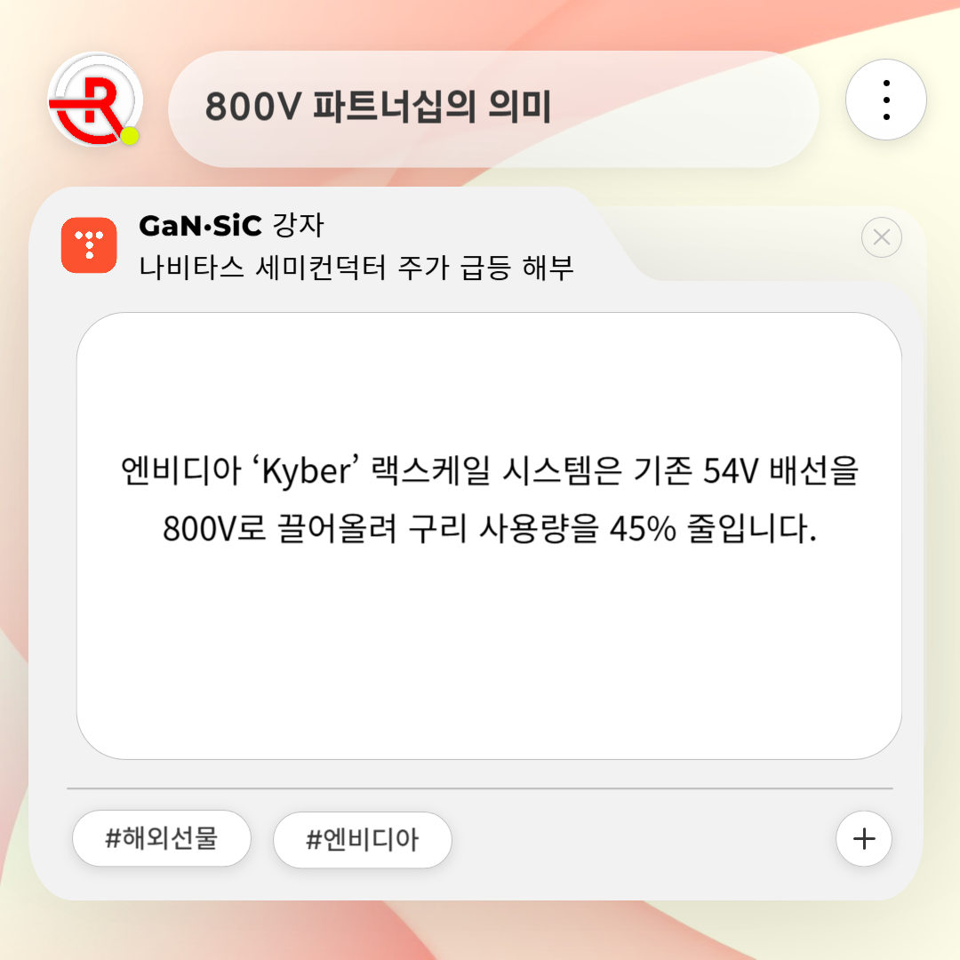 엔비디아 ‘Kyber’ 랙스케일 시스템은 기존 54V 배선을 800V로 끌어올려 구리 사용량을 45% 줄입니다. 나비타스 세미컨덕터의 GaNFast·GeneSiC 기술은 열 손실을 낮추고 냉각 비용까지 절감해 데이터센터 OPEX 구조를 뒤흔듭니다. 저는 지난달부터 전력 효율 지표가 우수한 반도체 기업만 모아 ‘AI 인프라 바스켓’을 만들었는데, 이번 발표로 포트 비중을 3% 추가했습니다.