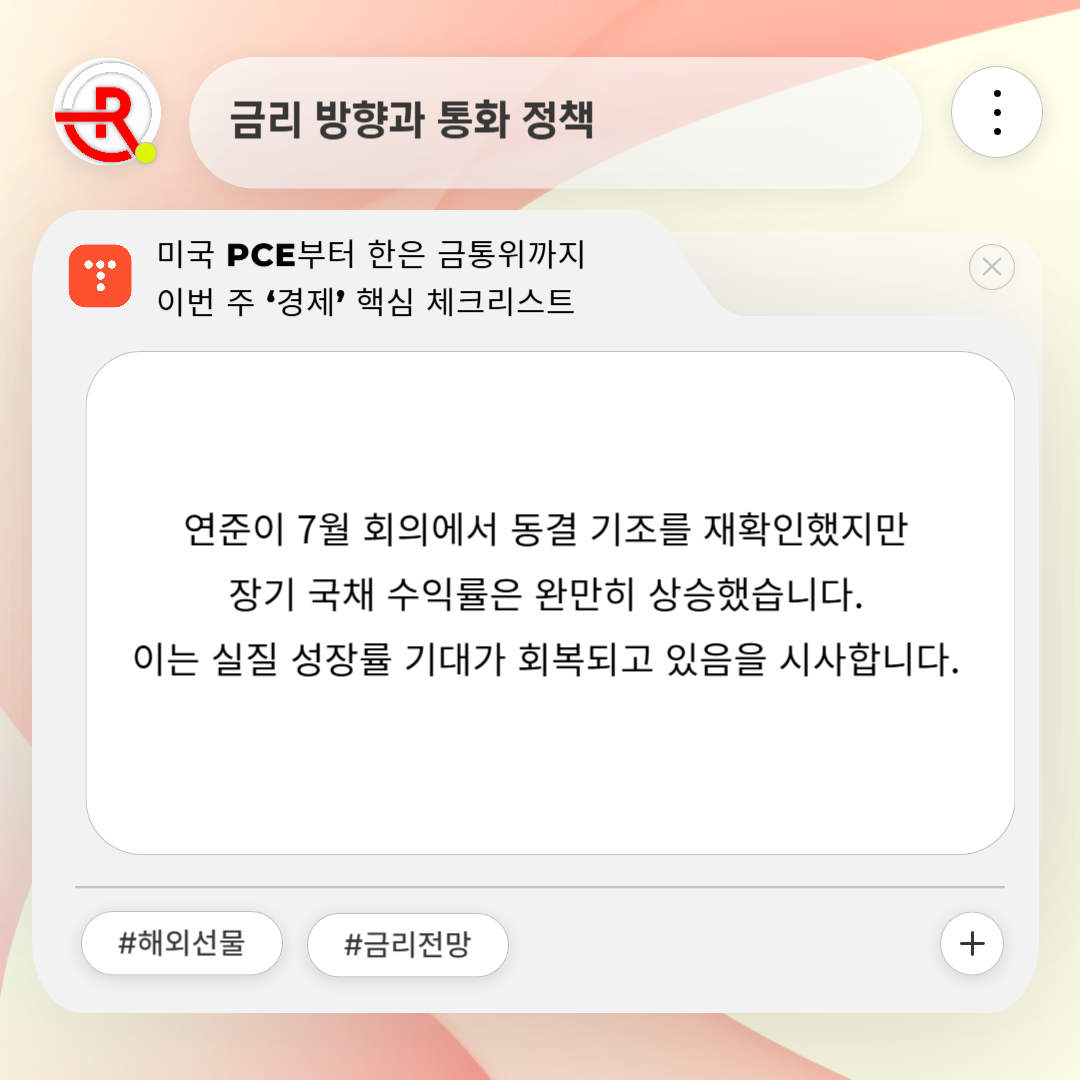 연준이 7월 회의에서 동결 기조를 재확인했지만 장기 국채 수익률은 완만히 상승했습니다. 이는 실질 성장률 기대가 회복되고 있음을 시사합니다. 작년 긴축 사이클에서 저는 만기 3년 이하 국채 ETF를 꾸준히 매수해 변동성을 흡수했습니다. 이번에도 단기물과 인플레이션 연동채 조합이 유효하다고 판단합니다.