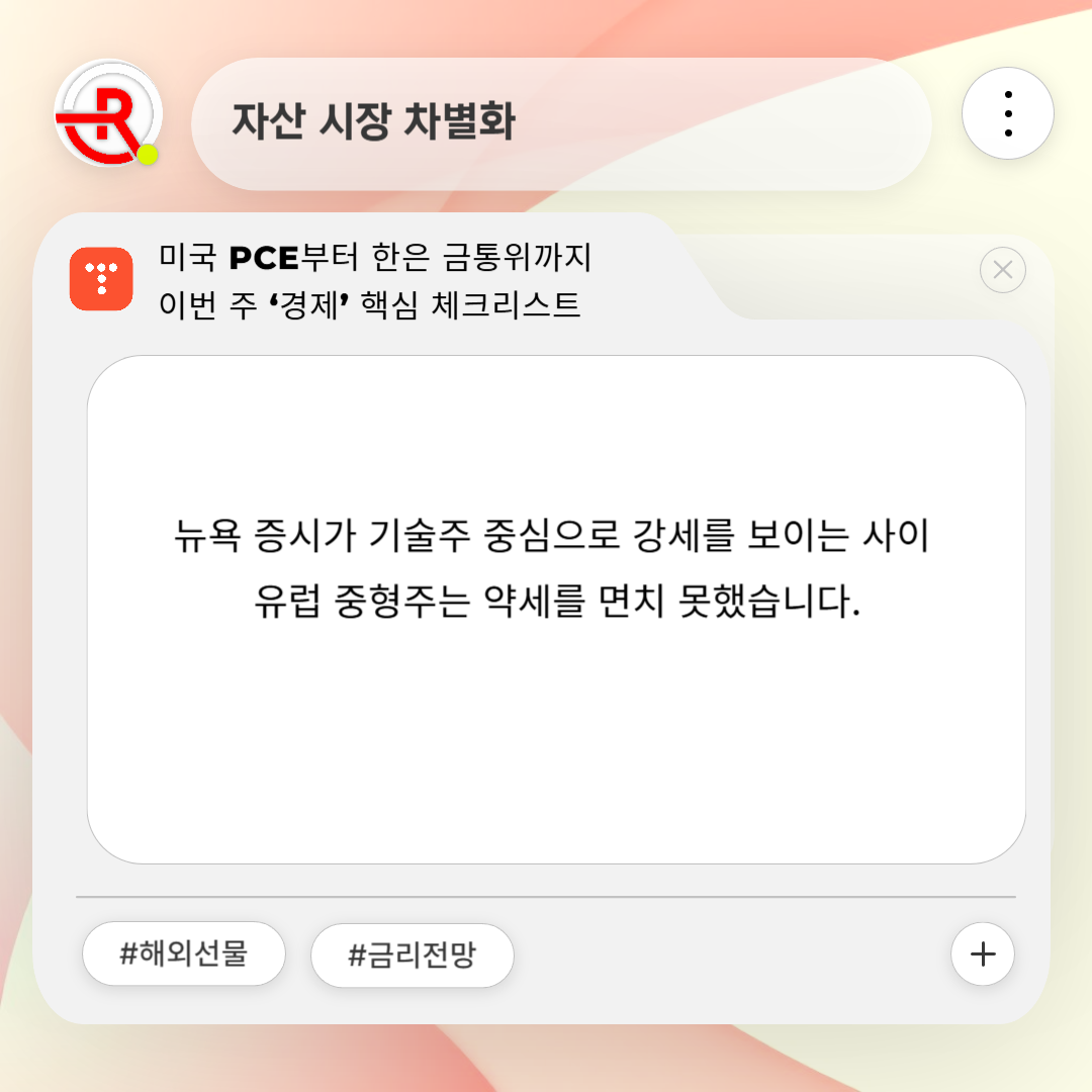 뉴욕 증시가 기술주 중심으로 강세를 보이는 사이 유럽 중형주는 약세를 면치 못했습니다. 저는 K-배당 ETF와 글로벌 리츠를 2 : 1 비율로 편입해 지역·섹터 분산을 시도했습니다. 변동성이 급증하면 금 ETF를 활용해 포트폴리오를 방어할 계획입니다.