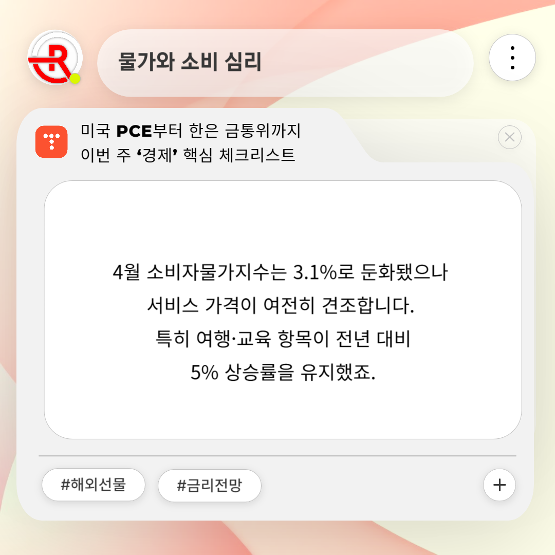 4월 소비자물가지수는 3.1%로 둔화됐으나 서비스 가격이 여전히 견조합니다. 특히 여행·교육 항목이 전년 대비 5% 상승률을 유지했죠. 직장인으로서 체감 물가가 떨어지지 않는다는 점이 소비 패턴에도 영향을 주고 있습니다. 제 개인 소비 지출은 필수품 위주로 옮겨갔고, 외식 횟수를 월 두 번으로 줄였습니다.