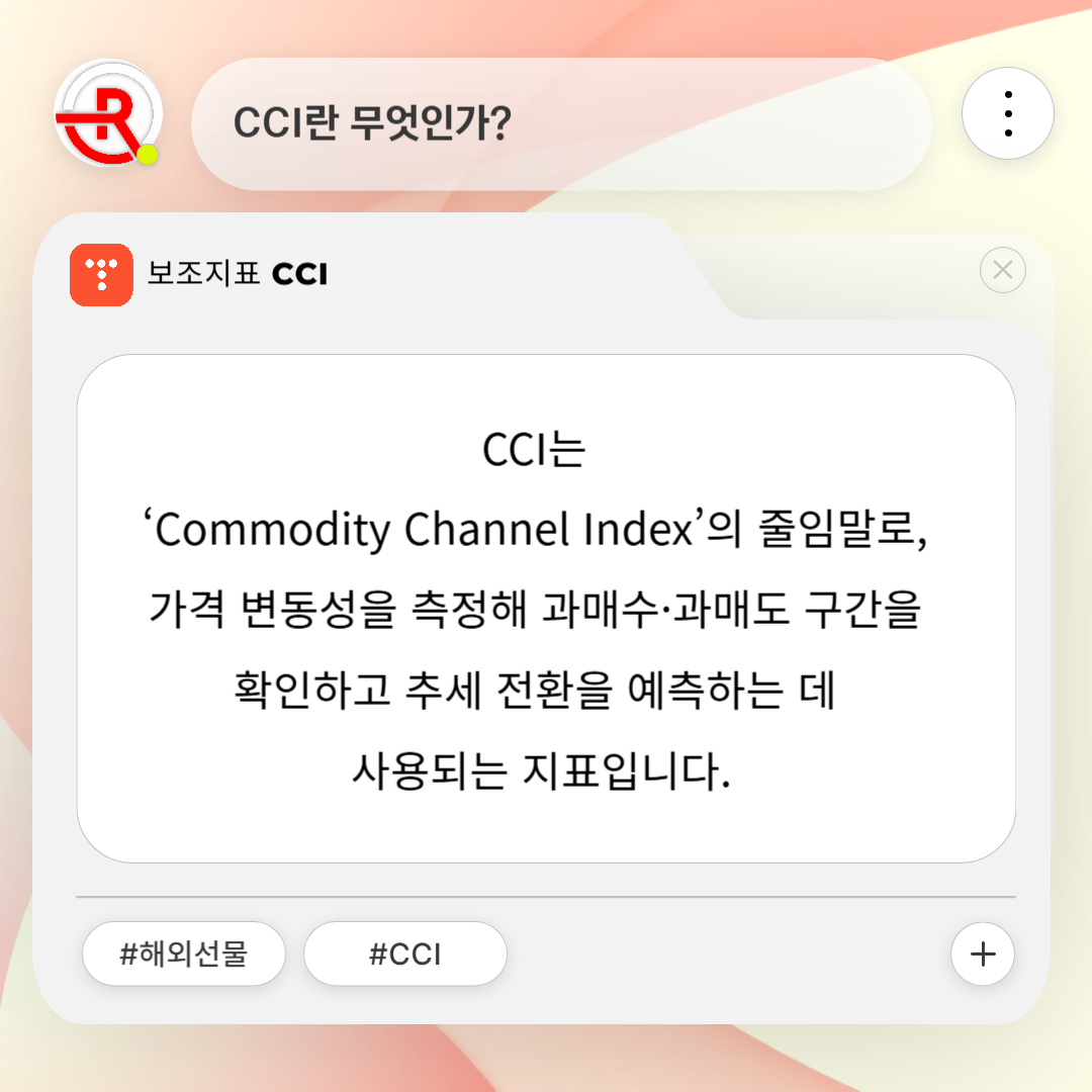 CCI는 ‘Commodity Channel Index’의 줄임말로, 가격 변동성을 측정해 과매수·과매도 구간을 확인하고 추세 전환을 예측하는 데 사용되는 지표입니다. 보통 +100 이상이면 과매수, -100 이하이면 과매도로 해석하는데, 저는 초기 매매 때 그 기준선을 무조건적 신호로 착각해 성급한 매수·매도를 자주 했었습니다. 몇 번 실패를 겪은 뒤에는, 항상 다른 오실레이터(RSI 등)와 병행해서 체크하곤 합니다.