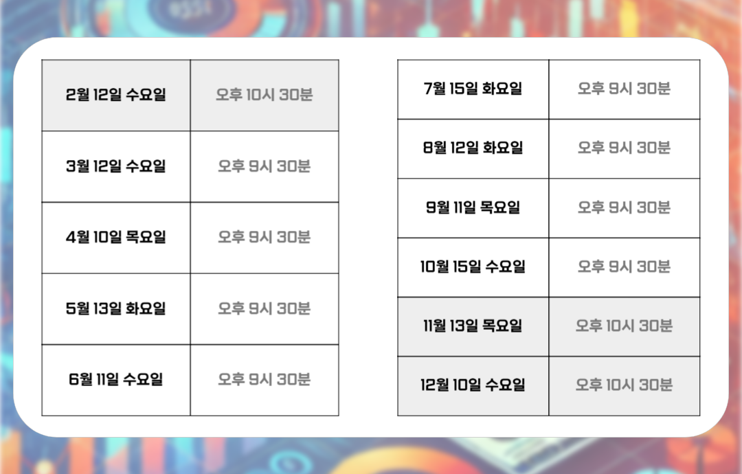 2025년 2월 CPI 발표는 2월 12일로 예정되어 있으며, 1월의 물가 변동을 반영합니다. 발표 시간은 한국 기준 오후 1시 30분입니다. 매월 정기적으로 공개되는 이 데이터는 시장 변동성에 영향을 줄 수 있습니다.