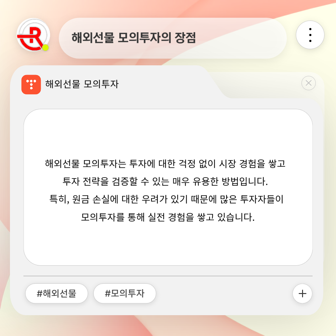 해외선물 모의투자는 투자에 대한 걱정 없이 시장 경험을 쌓고 투자 전략을 검증할 수 있는 매우 유용한 방법입니다. 특히, 원금 손실에 대한 우려가 있기 때문에 많은 투자자들이 모의투자를 통해 실전 경험을 쌓고 있습니다.