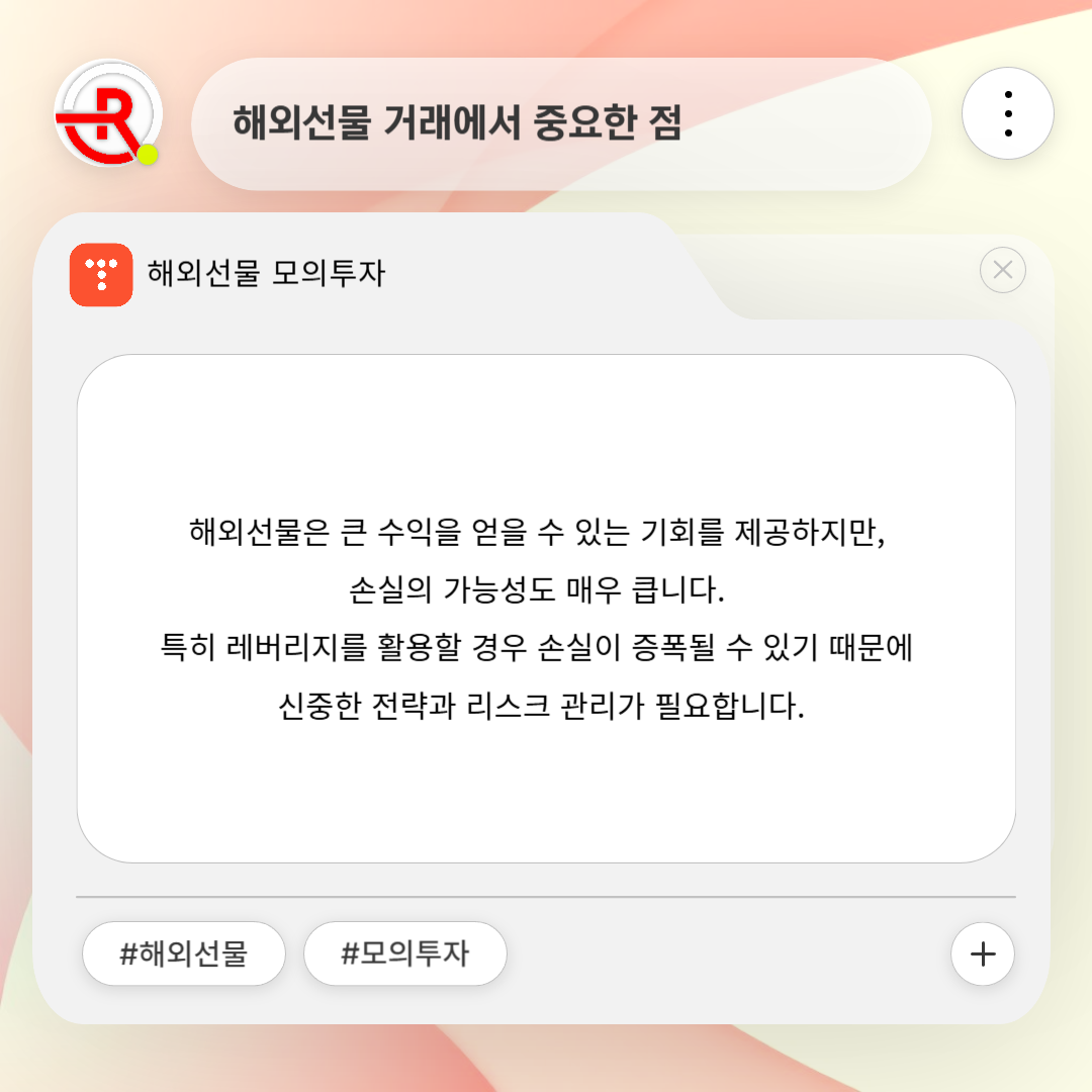 해외선물은 큰 수익을 얻을 수 있는 기회를 제공하지만, 손실의 가능성도 매우 큽니다. 특히 레버리지를 활용할 경우 손실이 증폭될 수 있기 때문에 신중한 전략과 리스크 관리가 필요합니다.