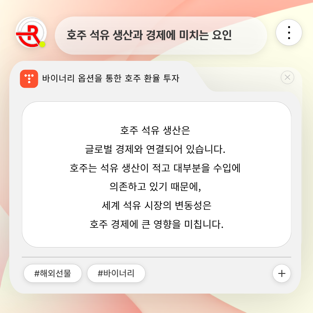 호주 석유 생산은 글로벌 경제와 연결되어 있습니다. 호주는 석유 생산이 적고 대부분을 수입에 의존하고 있기 때문에, 세계 석유 시장의 변동성은 호주 경제에 큰 영향을 미칩니다. 전쟁, 지역 갈등, 가격 상승 등 세계적인 정치적 요인들은 호주 환율에 직접적인 영향을 미칠 수 있습니다.