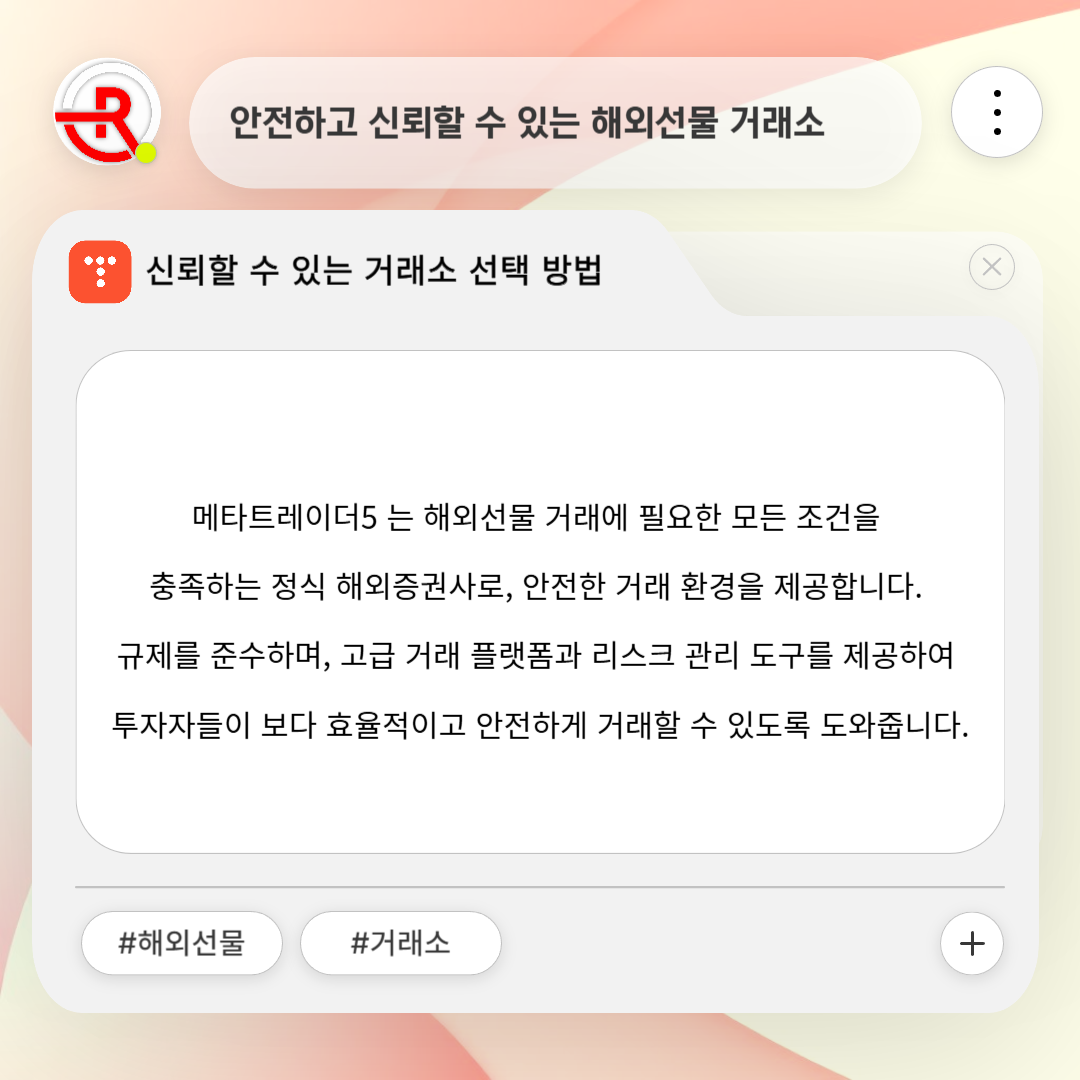 해외선물 거래는 높은 유동성, 다양한 자산 클래스, 레버리지 활용 등의 장점 덕분에 많은 투자자들에게 매력적인 투자 방법입니다. 하지만 리스크 관리와 신뢰할 수 있는 거래소 선택이 중요합니다. 메타트레이더5와 같은 정식 해외 증권사를 통해 안전하고 효율적인 거래를 시작해 보세요.