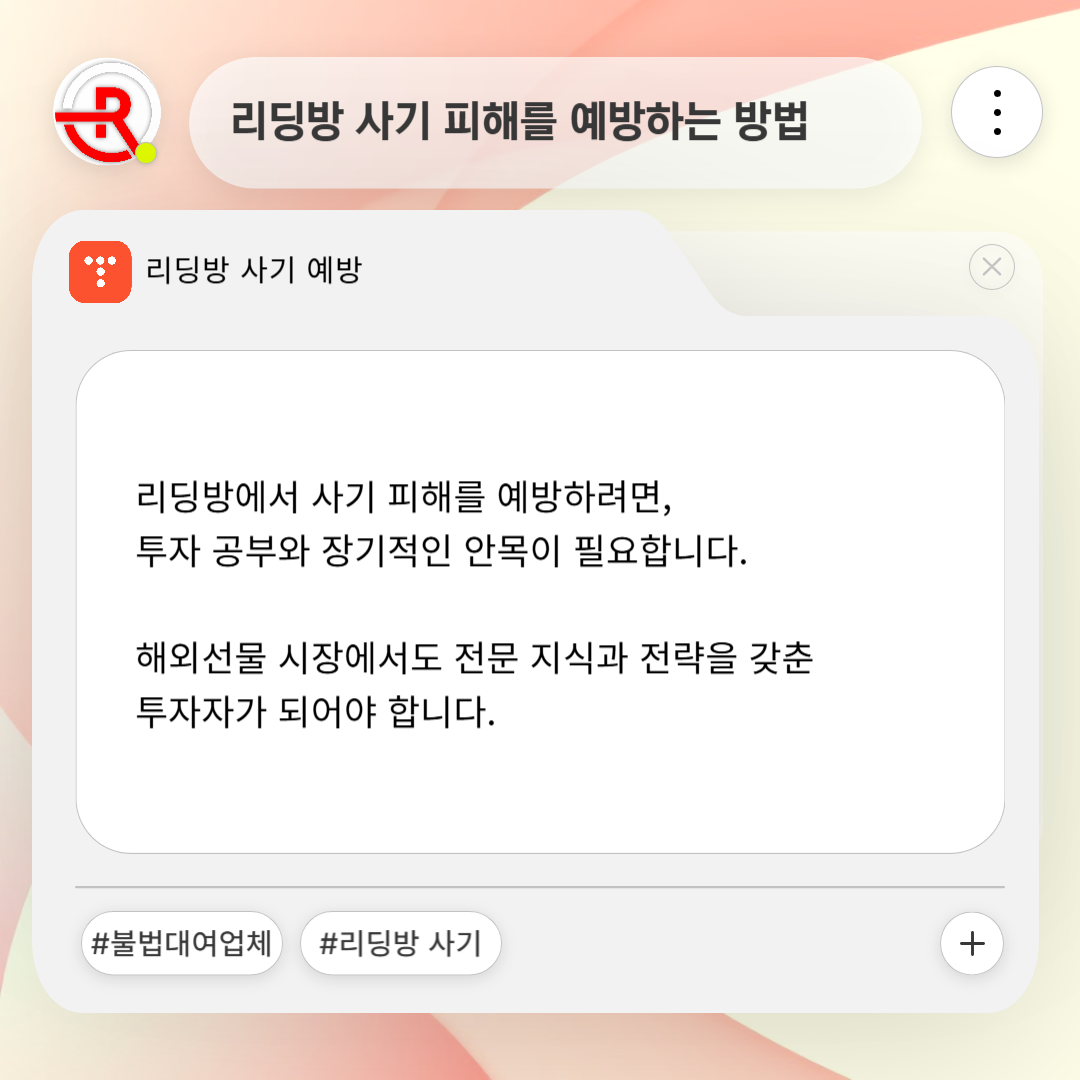 - 수익 약속: 하루에 수천만 원의 수익을 보장한다는 주장하는 리딩방은 경계해야 합니다. 투자는 리크스가 존재하는 활동이며, 과도한 수익 약속은 사기일 가능성이 큽니다.