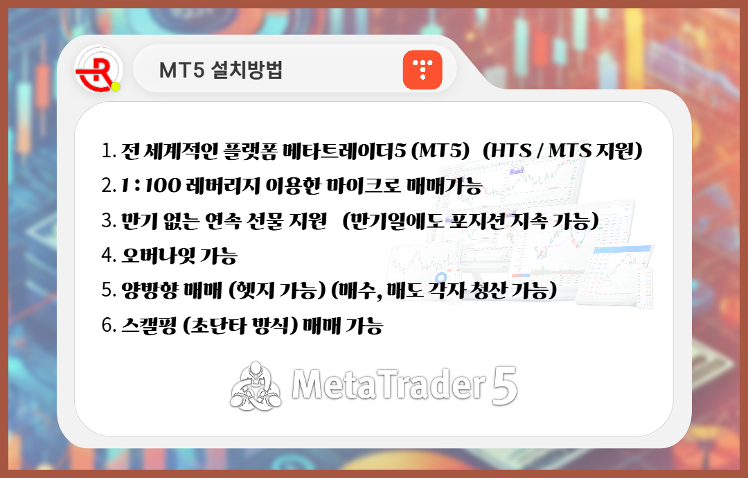 MT5는 이러한 해외선물 시장에서도 강력한 트레이딩 기능을 제공하며, 다양한 주문 방식과 자동매매 기능을 활용할 수 있습니다.